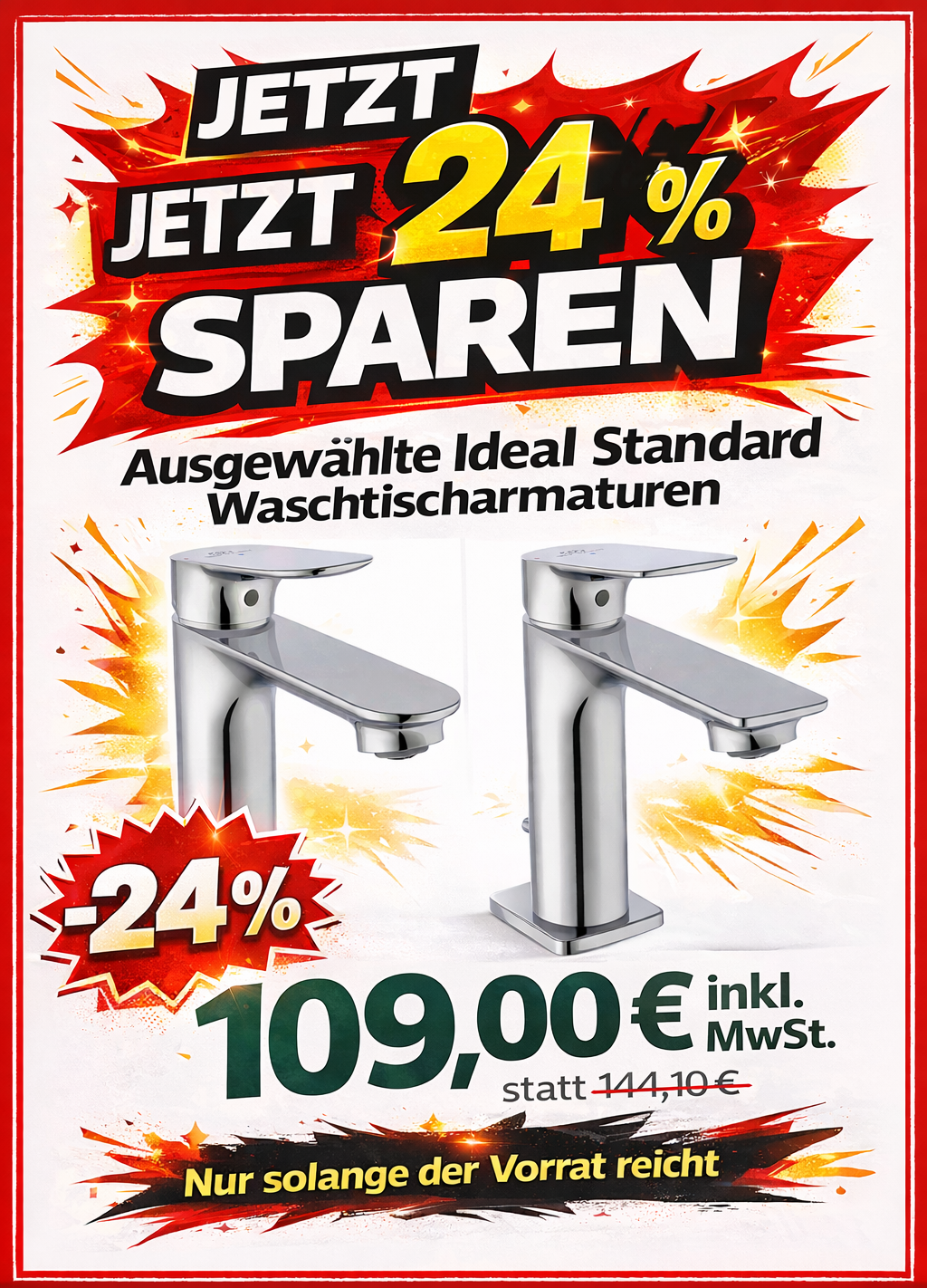 Ausgewählte Ideal Standard Waschtischarmaturen erhalten Sie aktuell mit 24 % Rabatt. Hochwertiges Design, bewährte Qualität – nur solange der Vorrat reicht. |
